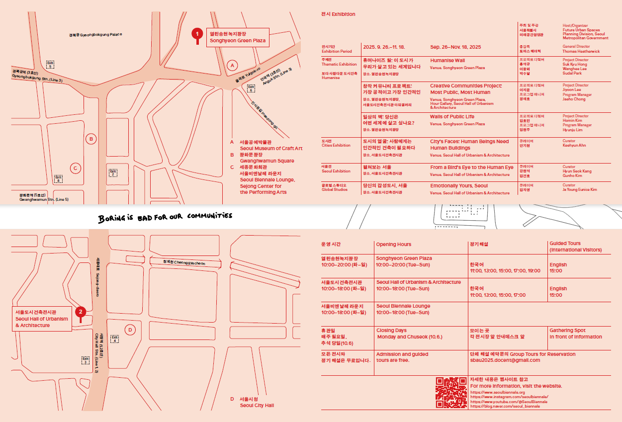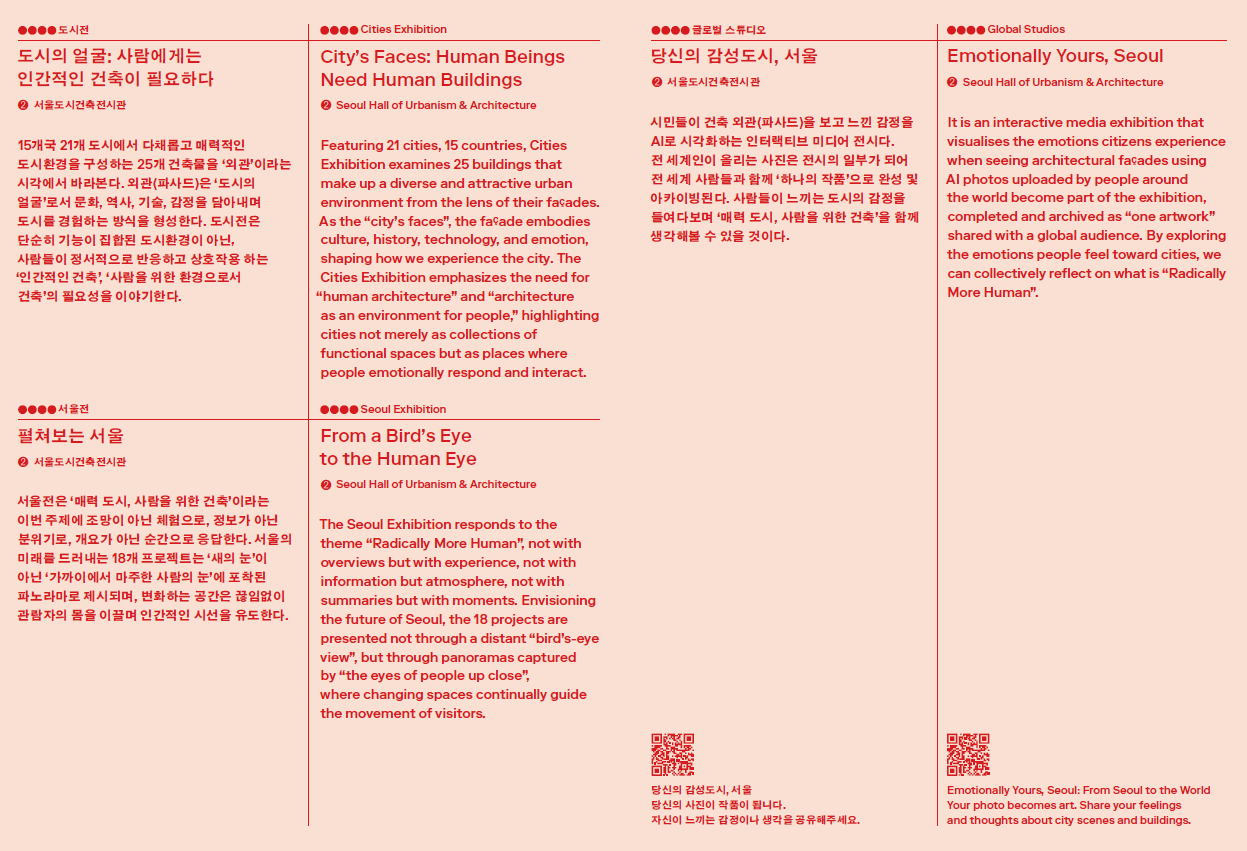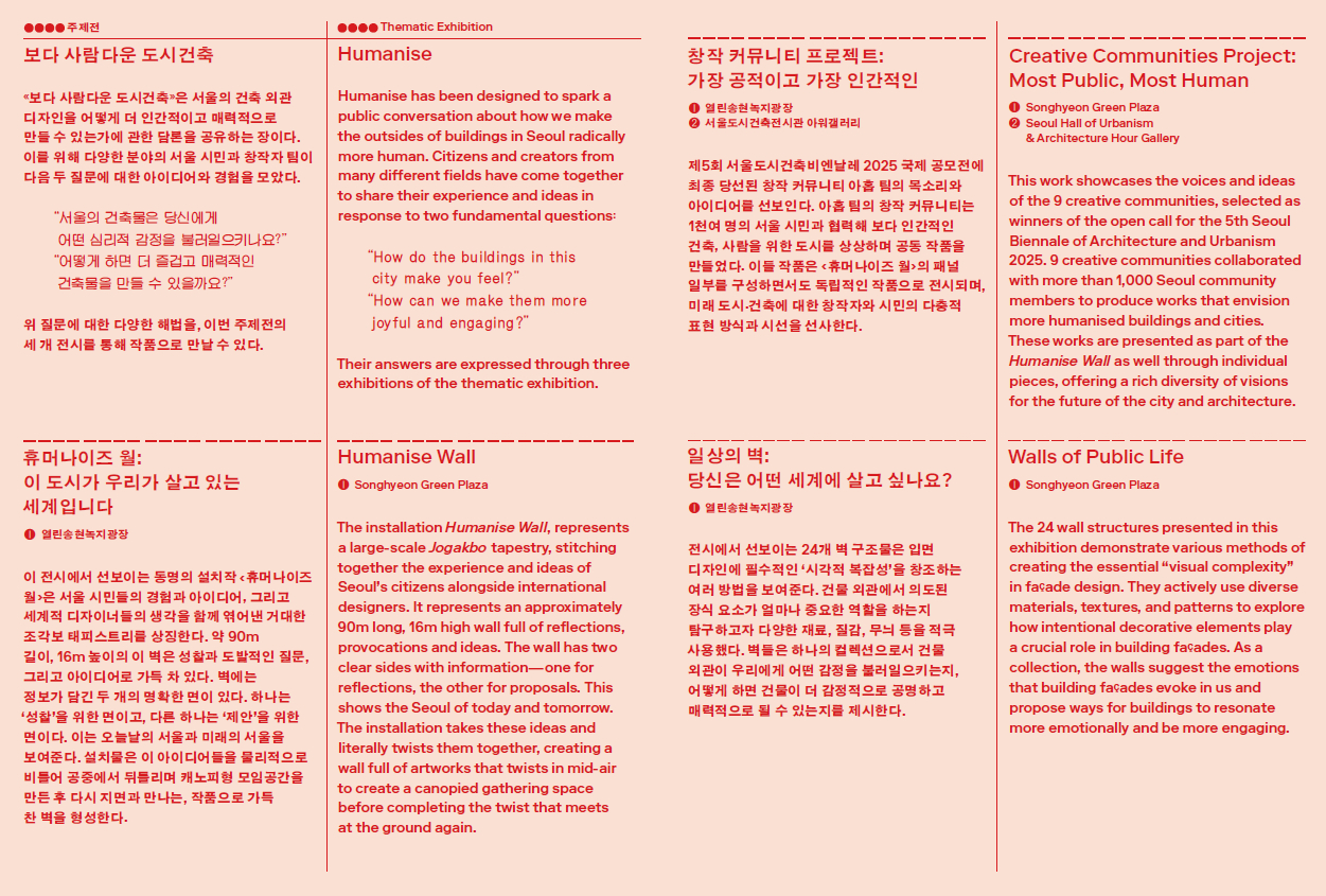 Welcome to the 5th Seoul Biennale of Architecture and Urbanism 2025. We think human beings deserve human buildings. Over the next 54 days, we are going to spark a public conversation about the outsides of buildings and how they affect the whole of society, revealing our emotional connection to architecture. We are going to celebrate buildings draped with detail, interest and delight, made to be loved and last. We are going to help make Seoul, and many other cities, radically more human.