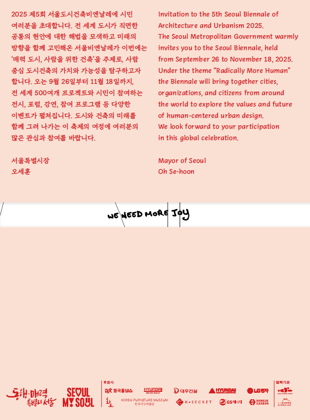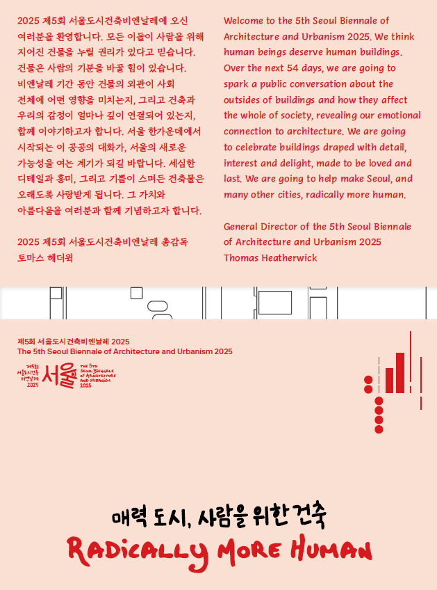 2025 제5회 서울도시건축비엔날레에 오신 여러분을 환영합니다. 모든 이들이 사람을 위해 지어진 건물을 누릴 권리가 있다고 믿습니다. 건물은 사람의 기분을 바꿀 힘이 있습니다.비엔날레 기간 동안 건물의 외관이 사회 전체에 어떤 영향을 미치는지, 그리고 건축과 우리의 감정이 얼마나 깊이 연결되어 있는지, 함께 이야기하고자 합니다. 서울 한가운데에서 시작되는 이 공공의 대화가, 서울의 새로운 가능성을 여는 계기가 되길 바랍니다. 세심한 디테일과 흥미, 그리고 기쁨이 스며든 건축물은 오래도록 사랑받게 됩니다. 그 가치와 아름다움을 여러분과 함께 기념하고자 합니다.