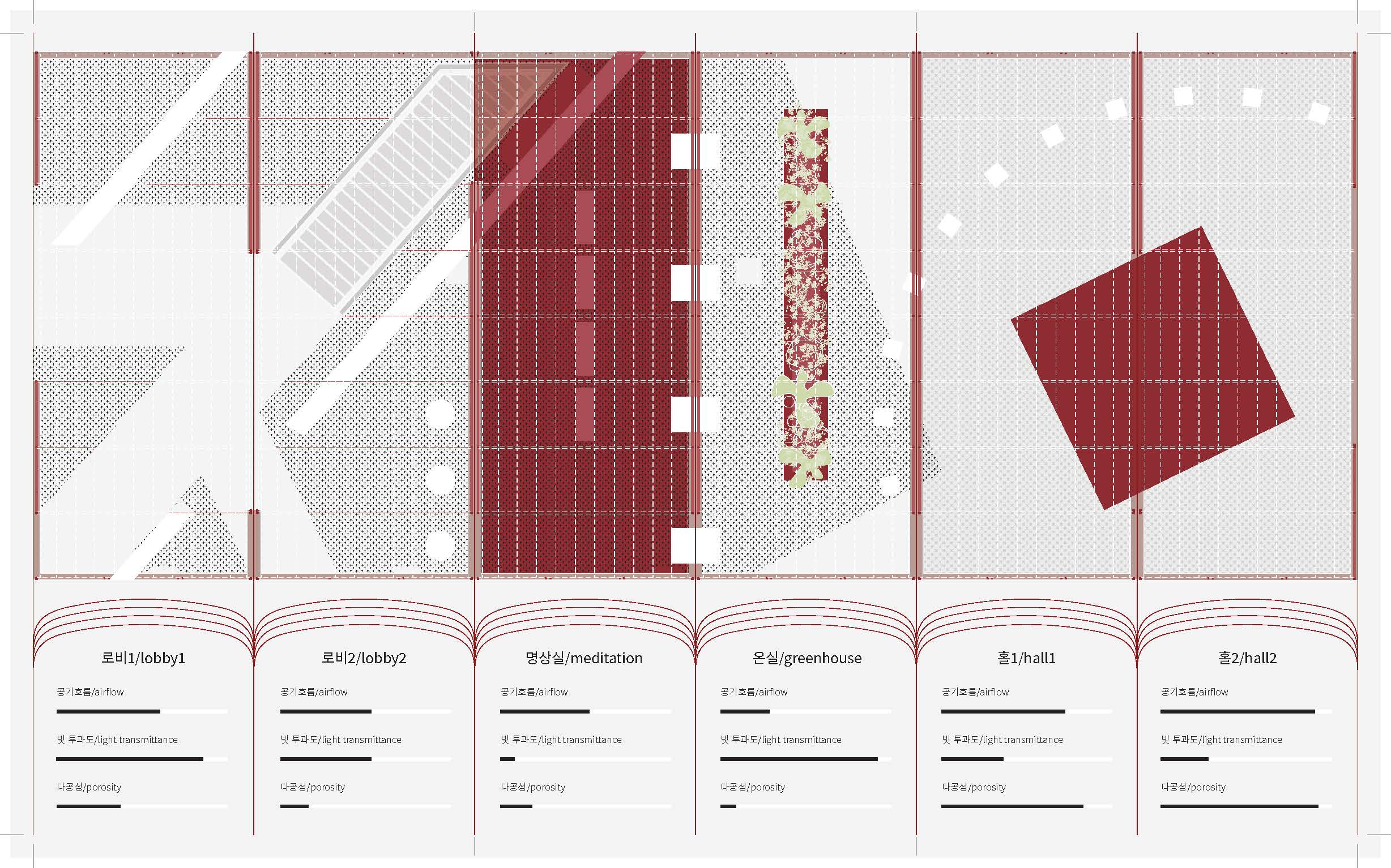 외부 환경에 노출되어 있는 서울마루에서 <식방마루>는 서울도시건축전시관의 새로운 지붕의 역할을 한다. <식방마루>는 온실과 유사하게 빛과 공기의 흐름을 활용하여 방문객들이 각 공간의 환경을 다양한 감각을 통해 체험할 수 있도록 제공한다. 투과도, 투명도, 그리고 다공성이 각기 다른 소재의 특성을 활용하여 각 프로그램에 맞는 환경을 조성하였으며, 이로써 방문객들이 서로 다르게 조성된 환경들 속에서 다양한 경험들과 행위들을 할 수 있도록 구성하였다. 총 6개의 베이(Bay)로 구성되어 있으며, 각 베이는 홀, 온실, 명상실, 로비 공간으로 활용된다. 훌과 로비는 2개 이상의 베이를 통합하여 휴식 공간이나 대규모의 행사 공간으로 사용되며 <식방마루> 중심에 위치한 온실과 명상실은 하나의 베이로 구성되었다. 이 각각의 프로그램들은 기후에 따른 다양한 경험을 표현한 공간으로, 빛을 조절하며 사람들이 모이고 바람이 스며들며 각자의 개별적인 환경에서 공간을 경험할 수 있도록 디자인되었다.
